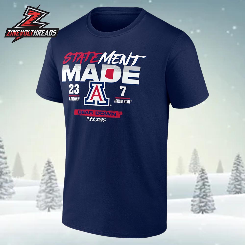 Celebrate a defining Rivalry Week victory with the Arizona Wildcats Vs Arizona State Sun Devils 2025 Score Unisex T-Shirt. Featuring the bold “Statement Made” graphic, the iconic block “A,” and the final score of 23–7, this shirt captures the excitement of Arizona’s commanding win on November 28, 2025. The design’s red, white, and navy palette highlights school spirit, while the subtle state outline adds a proud regional touch.