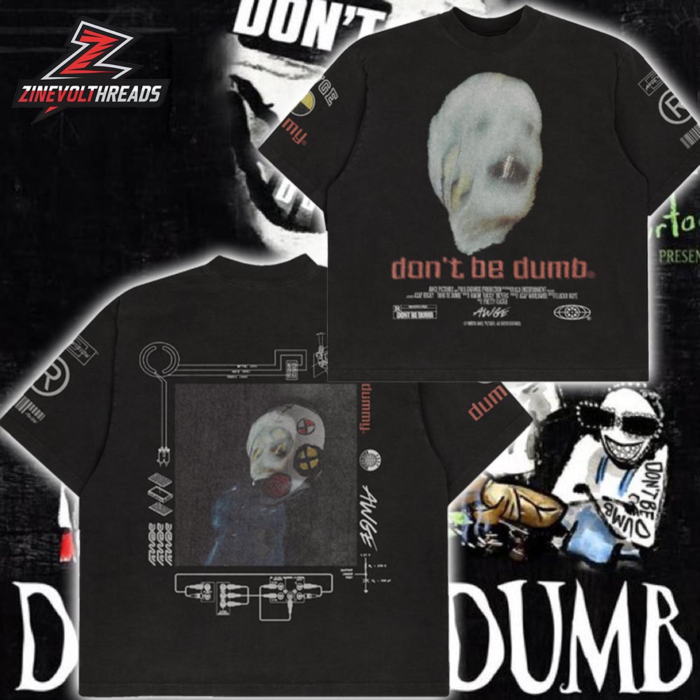 Make a bold statement with this unisex Dummy Tee inspired by ASAP Rocky’s boundary-pushing album Don’t Be Dumb. Featuring a haunting crash-dummy head graphic on the front and technical, schematic-style artwork on the back, this design channels the album’s dark, experimental energy. The muted tones, distorted textures, and industrial details reflect a raw commentary on identity, pressure, and modern culture—turning album visuals into wearable art.