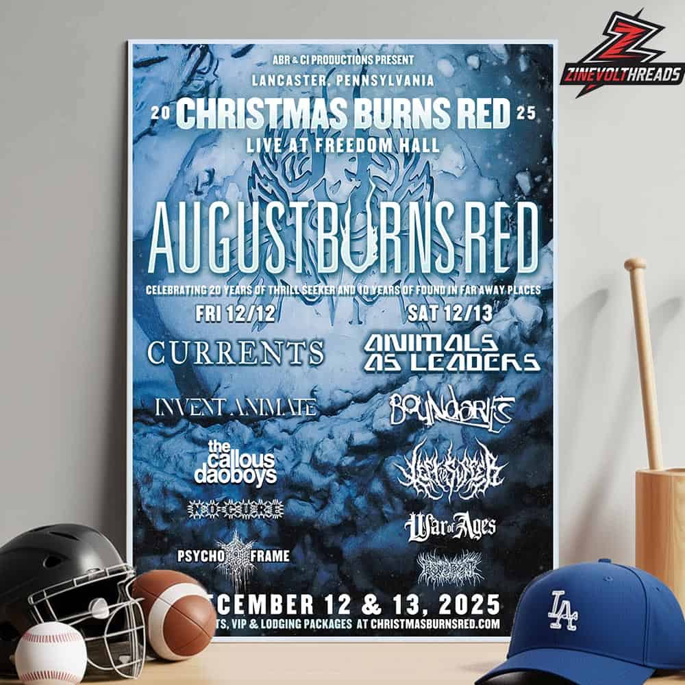 Bring the intensity of one of metalcore’s biggest annual events into your home with this striking Christmas Burns Red 2025 August Burns Red Poster Canvas. Featuring a bold icy-blue theme, intricate textures, and the iconic ABR logo, this artwork highlights the band’s special two-night celebration at Freedom Hall in Lancaster, Pennsylvania. With supporting acts like Currents, Invent Animate, Animals As Leaders, Boundaries, and more, the design captures the full adrenaline of a stacked festival lineup.