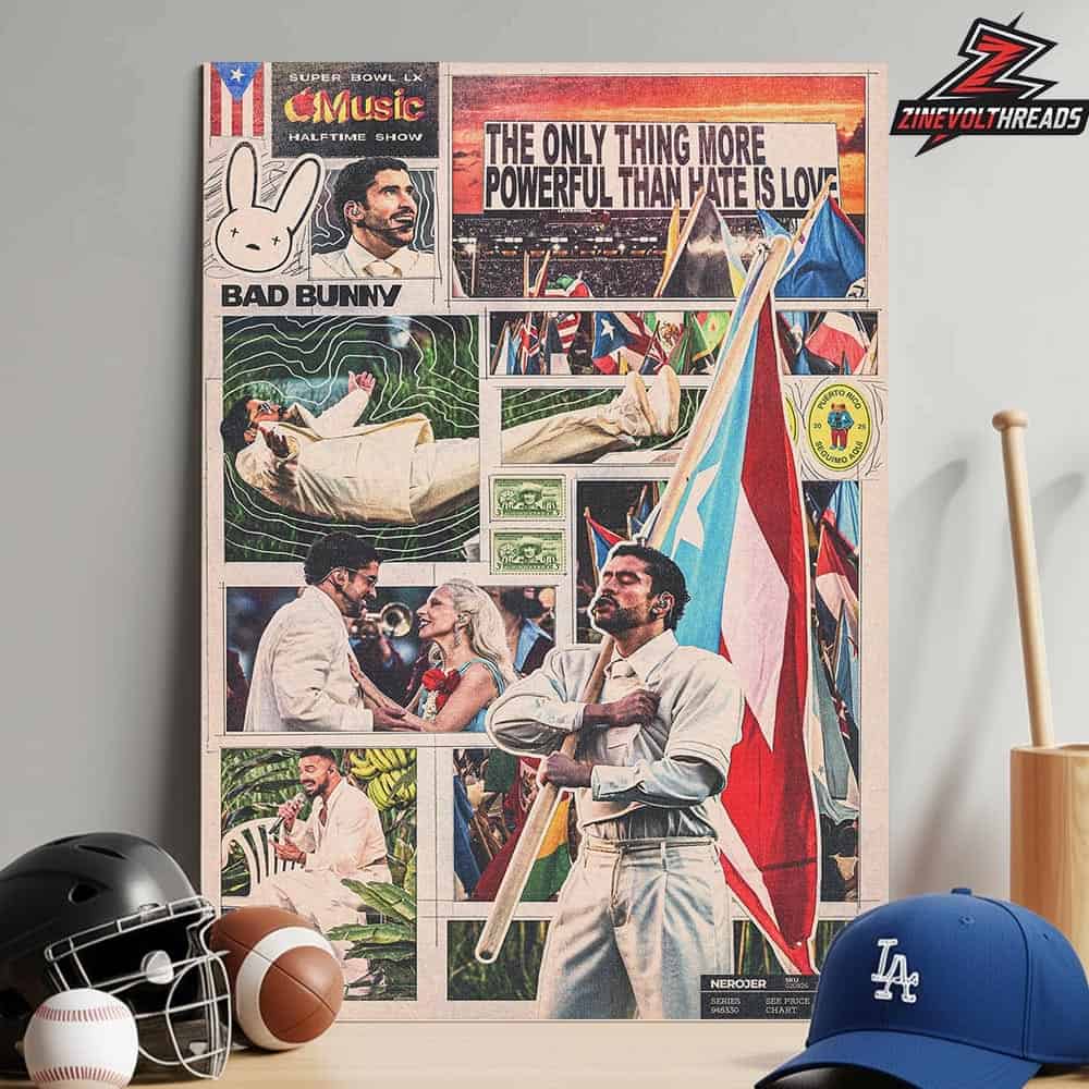 Product Highlights: Wall Art Featuring Bad Bunny Halftime Show Super Bowl LX The Only Thing More Powerful Than Hate Is Love Home Decor Poster Canvas
