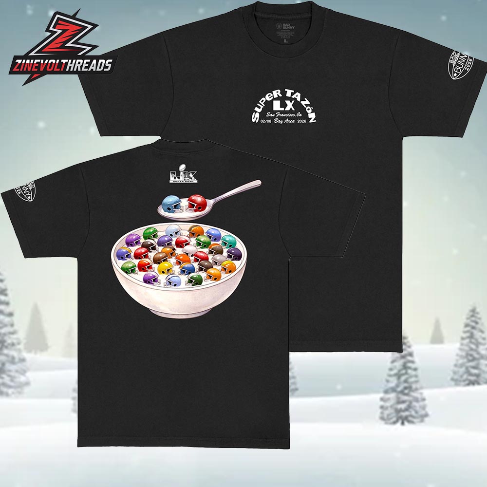 Get ready to mix pop culture with gridiron flair in the Bad Bunny x Super Tazón Cereal Bowl Two Sided Unisex T-Shirt. This creative fan tee brings a playful twist to Super Bowl style with its two-sided design — the front features bold “Super Tazón LX” text highlighting the event, while the back surprises with a colorful bowl of miniature football helmets that look like cereal in a fun and artistic graphic inspired by Bad Bunny’s unique aesthetic. It’s the perfect way to celebrate football season with personality and flair.