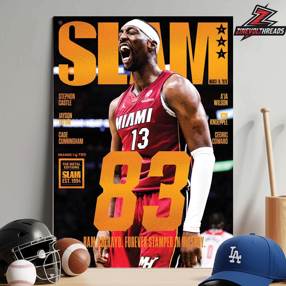 Make a bold statement with the Bam Adebayo Miami Heat On Orange Metal Slam 261 Cover Magazine Bam Adebayo Forever Stamped In History Home Decor Poster Canvas. This striking design reimagines the iconic SLAM cover with a powerful orange metal aesthetic, featuring Bam Adebayo in an intense, triumphant pose. The oversized “83” graphic, vibrant orange tones, and strong typography create a high-impact visual that celebrates Bam’s dominance and legacy with the Miami Heat.