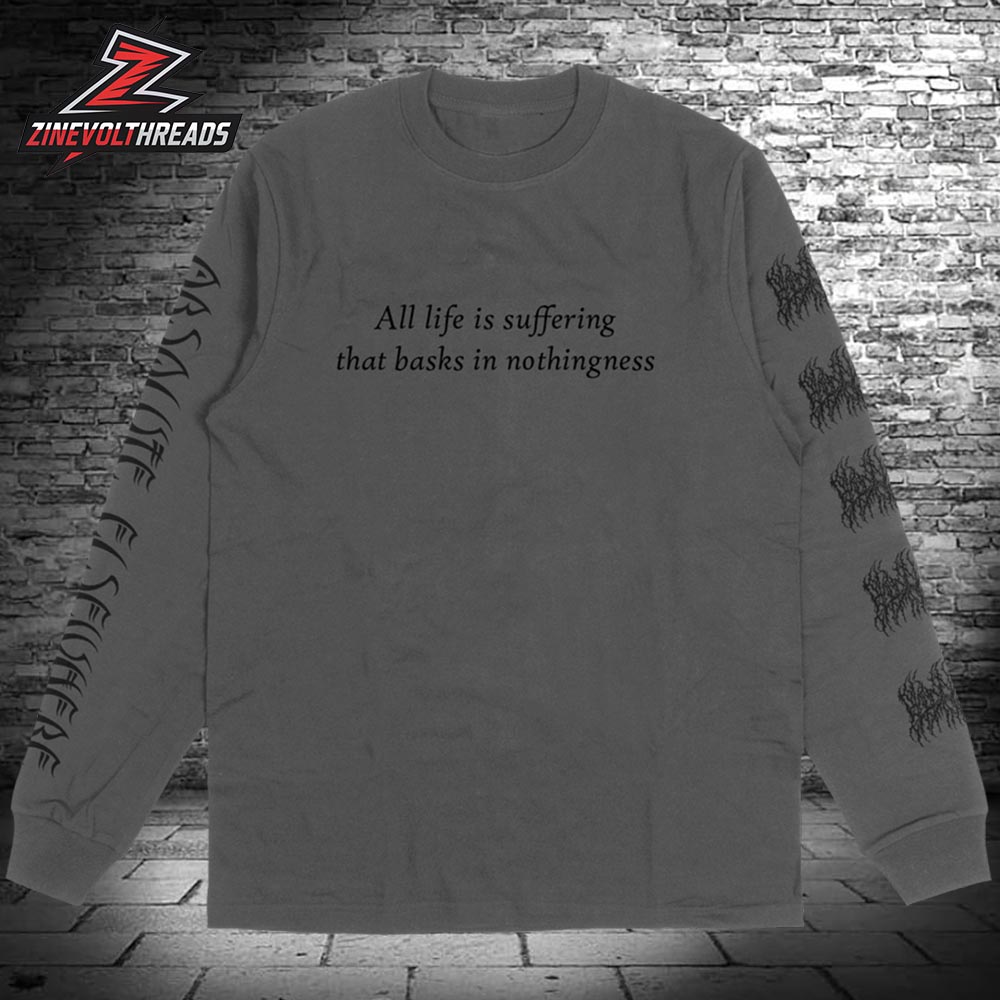 Embrace the cosmic gloom and existential energy of Blood Incantation with the Blood Incantation All Life Is Suffering Long Sleeve Holiday Merch Classic T-Shirt. Featuring the stark phrase “All life is suffering that basks in nothingness” across the chest, this design channels the band’s signature blend of atmospheric death metal and philosophical darkness. The sleeves showcase abstract black-metal–inspired graphics and stylized lettering, giving the shirt a raw underground aesthetic perfect for fans of the genre.