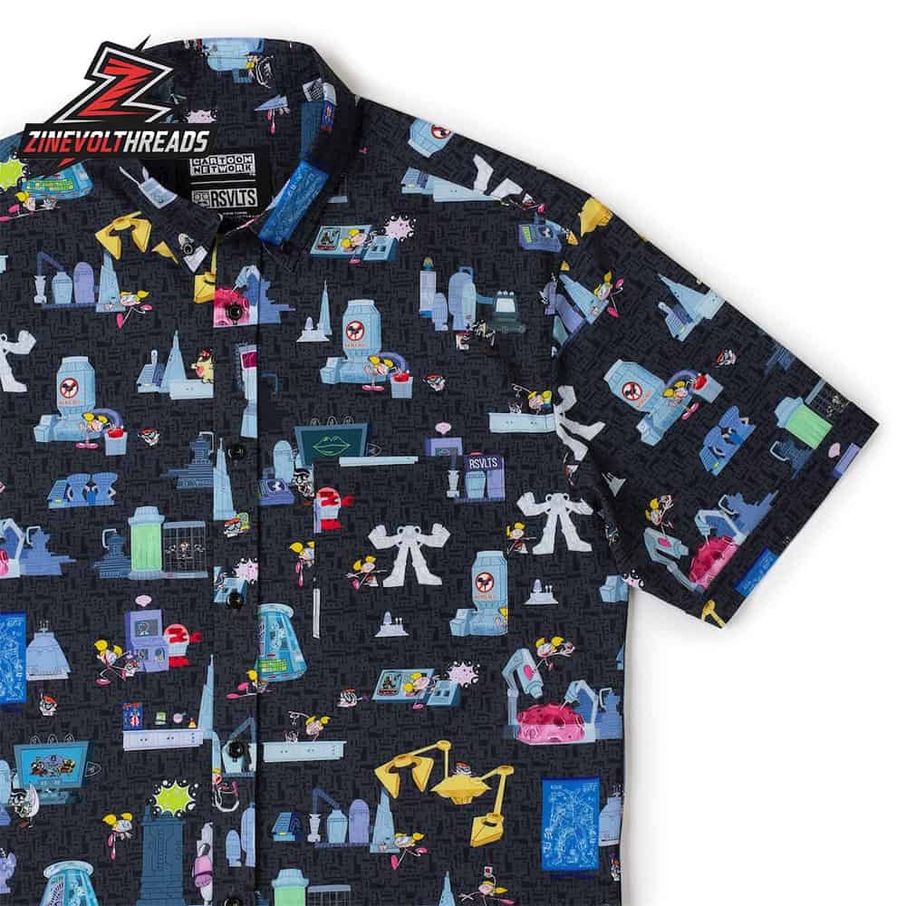 The Cartoon Network DEE DEE KUNUFLEX Short Sleeve Hawaiian Shirt brings mischievous energy and classic cartoon nostalgia together in one bold design. Inspired by the unforgettable antics of Dee Dee from Cartoon Network, this all-over print captures a whimsical cartoon laboratory world filled with quirky machines, explosive experiments, and playful mayhem. Set against a dark backdrop, the colorful illustrations pop with retro animation charm that instantly speaks to fans of iconic Cartoon Network classics.