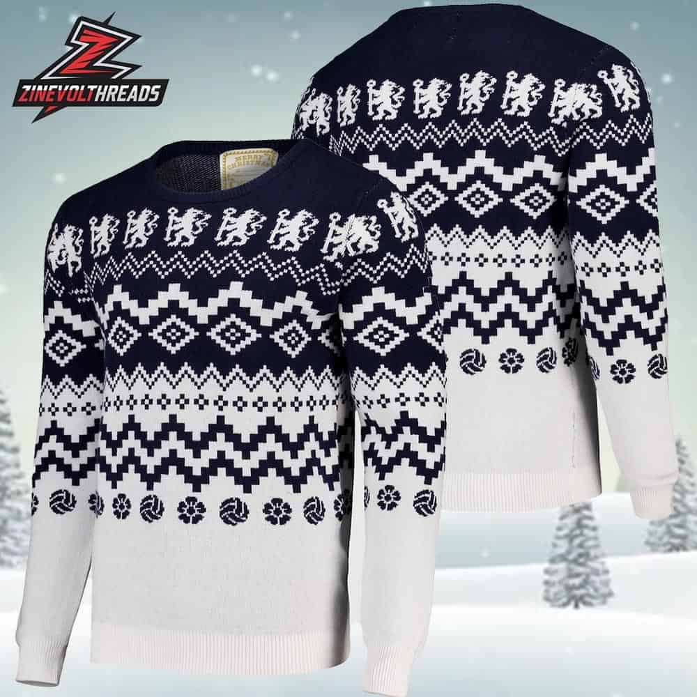 Celebrate the holidays in classic London style with the Chelsea Premium Christmas Jumper. Designed in a rich midnight blue and white palette, this sweater features intricate Nordic-inspired patterns and a row of proud lions — a subtle nod to Chelsea’s iconic identity. The clean, stylish design makes it perfect for Christmas parties, winter gatherings, match-day festivities, or simply staying warm while showing your Blues pride.
