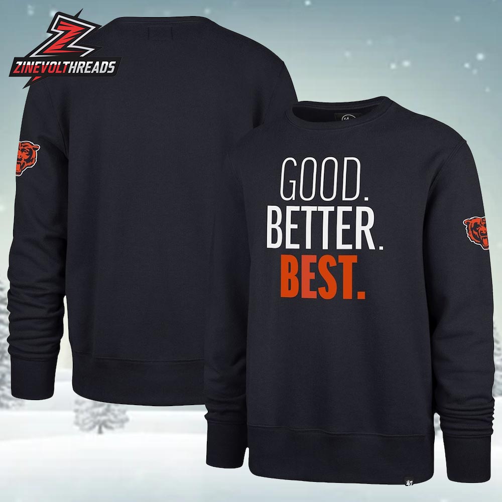 Rep your team pride with the Chicago Bears NFL Good. Better. Best. Navy Sweatshirt Holiday Merch Classic T-Shirt. Featuring a bold vertical slogan in crisp white and signature Bears orange, this design delivers a powerful message that reflects Chicagoโs relentless spirit. The embroidered Bears logo on each sleeve adds an authentic touch, making this sweatshirt the perfect blend of team loyalty and modern streetwear style.