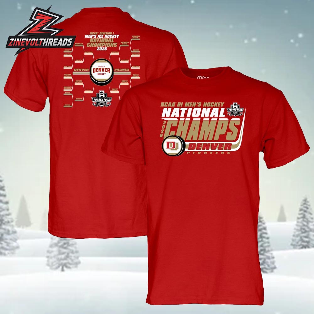 Product Spotlight: Denver Pioneers 2026 NCAA Frozen Four Men's Ice Hockey National Champions Bracket Two Sided Unisex T-Shirt