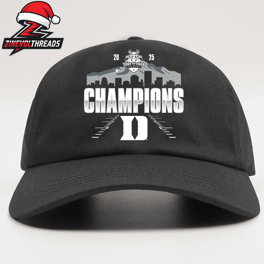 Celebrate a championship season in style with the Duke Blue Devils 2025 NCAA Football Tony the Tiger Sun Bowl Champions Snapback Hat. The front design features bold βChampionsβ lettering, the iconic Duke βD,β and Tony the Tiger Sun Bowl branding, set against a skyline-inspired graphic that highlights the significance of this bowl game victory. Finished in a classic black colorway, this cap delivers a clean, confident look that proudly represents fans of the Duke Blue Devils.
