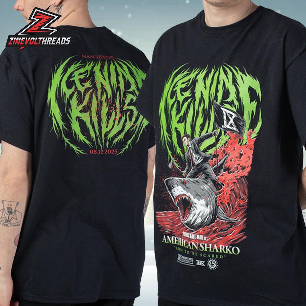 Unleash cinematic chaos with the Ice Nine Kills EU Tour Pop Up Stores 2025 Manchester Tee, commemorating the band’s Manchester stop on December 9th. This two-sided unisex T-shirt explodes with horror-metal storytelling, featuring a ferocious shark-riding scene drenched in blood-red motion on the front, crowned by jagged neon-green typography. The back marks the Manchester date with bold tour lettering, locking in a moment that blends shock, spectacle, and unmistakable attitude from Ice Nine Kills.