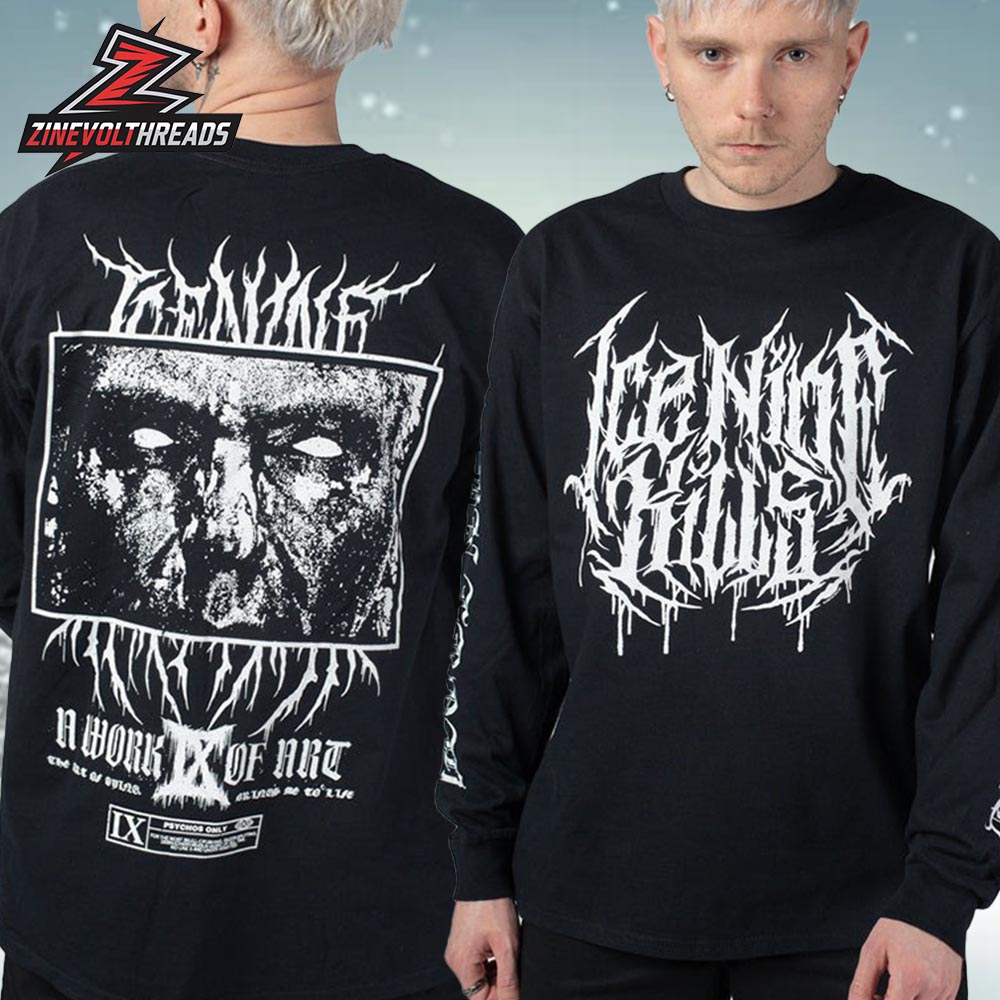 Crafted from premium-quality fabric with a comfortable unisex fit, this Ice Nine Kills longsleeve graphic T-shirt is built for colder shows, layered streetwear looks, or collectors seeking exclusive tour-era merch. The extended sleeves add attitude and versatility, while the high-contrast print ensures long-lasting impact. Whether worn as a statement piece or preserved as a 2025 EU pop-up exclusive, this longsleeve stands as a fearless expression of horror, music, and uncompromising visual art. Ice Nine Kills