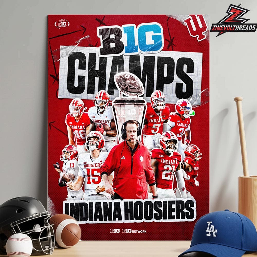 Product Highlights: Wall Art Featuring Indiana Hoosiers Black 2025 Big Ten Football Champions Flags Two Sided Unisex T-Shirt