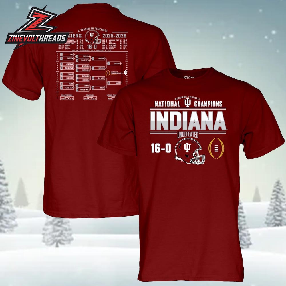 Celebrate a perfect championship journey with the Indiana Hoosiers College Football Playoff National Champions 2025 Bracket Two-Sided Unisex T-Shirt. The front proudly showcases bold “Indiana National Champions” lettering with the iconic IU helmet and an undefeated 16–0 record, while the back features the complete College Football Playoff bracket—documenting every step of Indiana’s historic run to the title. This design tells the full story of dominance, resilience, and belief that defined the Hoosiers’ championship season.