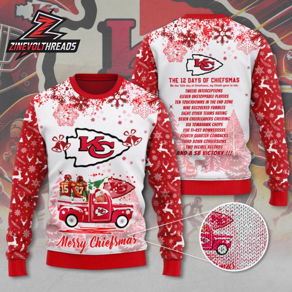 Bring the joy of the holidays and the excitement of game day together with the Kansas City Chiefs 12 Days of Chiefsmas Sweater. Featuring a playful Chiefs-themed take on the classic โ12 Days of Christmas,โ this festive design showcases bold red-and-white colors, snowflakes, reindeer, and the iconic Chiefs logo. The front displays a cheerful holiday truck carrying fan-favorite players, while the back lists all twelve Chiefsmas lines for a fun, spirited twist.