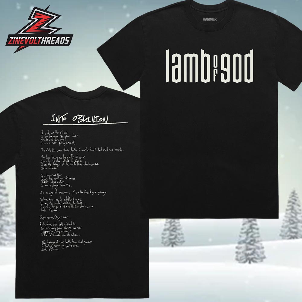 Channel pure metal energy with the Lamb Of God Metal Hammer Issue 411 Cover Two-Sided Unisex T-Shirt. The front features a striking “Lamb of God” graphic in a clean, powerful typeface, while the back showcases handwritten-style lyrics inspired by “Into Oblivion”—giving this tee an authentic, raw edge that true fans will appreciate.