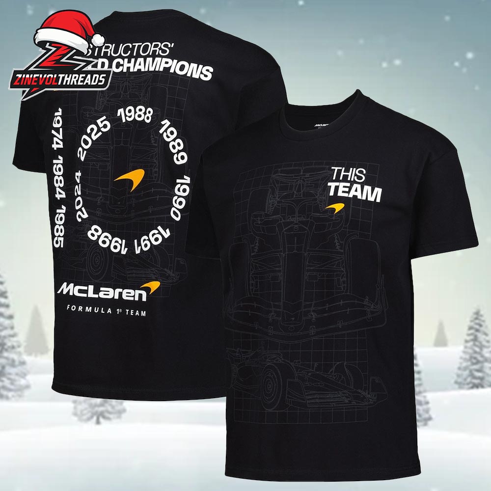Celebrate a historic season with this bold 2025 Constructors’ Championship Road Map Tee, designed for fans who live and breathe Formula 1. The front features a sleek technical outline of a modern race car paired with the powerful statement “THIS TEAM,” emphasizing unity, precision, and world-class engineering. Its minimalist grid-style artwork gives the shirt a clean, futuristic motorsport aesthetic perfect for race weekends or everyday wear.
