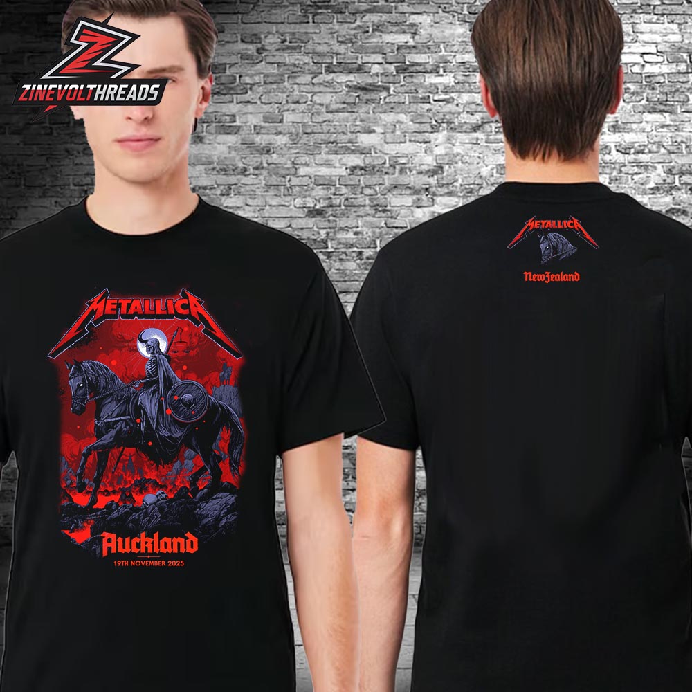 Commemorate an unforgettable stop on the M72 World Tour with the Metallica M72 World Tour 2025 Venue Tee Merch Pop Up Shop At Eden Park Auckland New Zealand On November 19th 2025 Two Sided Classic T-Shirt. The front features a striking red-and-black illustration of a dark rider on horseback, surrounded by fiery chaos—a powerful visual that echoes Metallica’s signature intensity. The bold “Auckland” venue text completes the artwork, making this tee a perfect collectible for fans who experienced the show or want to celebrate the tour’s global impact.