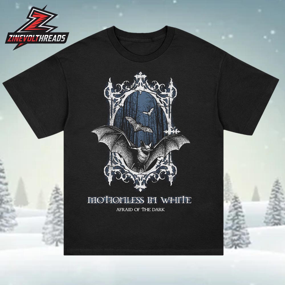 Embrace the haunting atmosphere of modern metal with the Motionless In White Afraid Of The Dark Bat Tee Unisex T-Shirt. Featuring a striking gothic bat illustration framed by ornate, cathedral-inspired details, this design perfectly captures the band’s dark, emotional identity. The eerie forest backdrop and high-contrast monochrome artwork create a bold visual statement that instantly connects with fans of heavy music, gothic culture, and alternative streetwear.