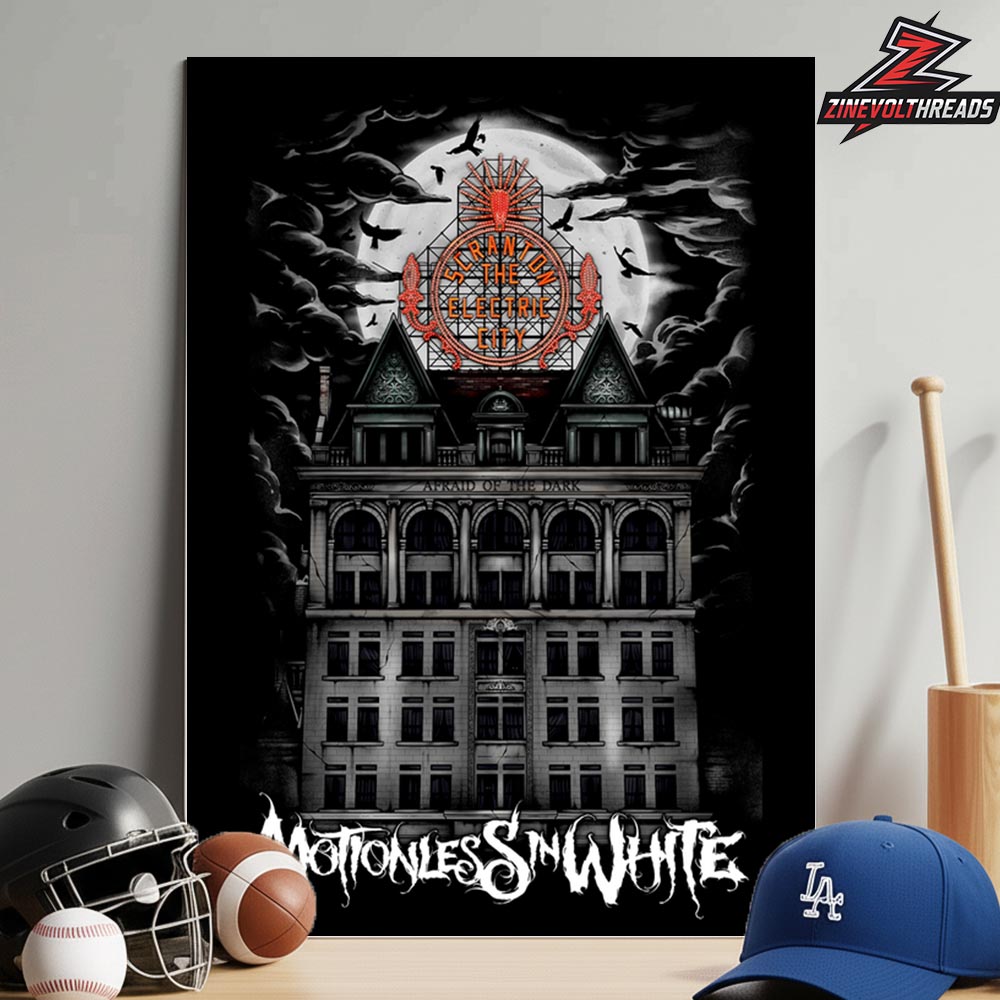 Transform your space with haunting intensity through the Motionless In White Afraid Of The Dark Poster Merch Limited Home Decor Poster Canvas. Inspired by the signature horror-infused visuals of Motionless In White, this artwork showcases a gothic architectural scene wrapped in shadows, storm clouds, and ominous symbolism. The stark contrast, monochrome tones, and glowing central emblem create a powerful visual narrative that reflects the band’s themes of darkness, fear, and inner conflict.