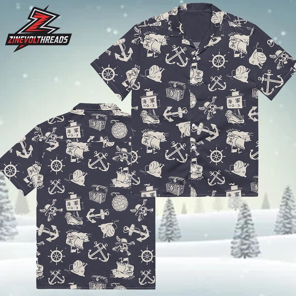 Embrace the spirit of the open sea with the One Piece Live Action Season 2 Sea Pattern Button-Up Hawaiian Shirt. Featuring a detailed all-over print of anchors, ships, treasure chests, skull motifs, and nautical symbols, this design captures the essence of pirate life on the Grand Line. The monochrome navy palette gives it a clean, versatile look while still staying true to the adventurous One Piece vibe.