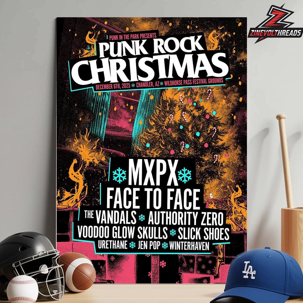 Celebrate the loudest season of the year with the Punk Rock Christmas Punk In The Park Presents At Chandler AZ On December 6th 2025 Home Decor Poster Canvas. Featuring a gritty, neon-lit holiday scene with bold typography and the full concert lineup—including MXPX, Face to Face, The Vandals, Authority Zero, and more—this poster captures the explosive energy of a punk rock Christmas festival. Its chaotic textures and vibrant colors create a striking piece of art for any music lover.