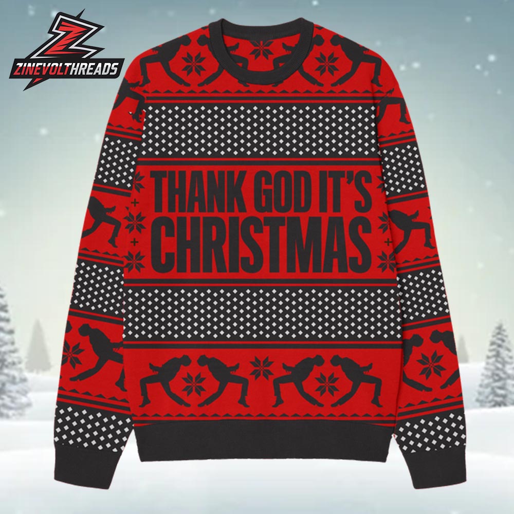 Celebrate the season with legendary rock style in the Queen Band Mercury Phoenix Trust Thank God It’s Christmas Jumper Ugly Sweater. Inspired by the band’s beloved holiday anthem, this bold red-and-black jumper features large statement lettering and festive patterned graphics, including silhouettes of Freddie Mercury’s iconic pose woven throughout the design. It’s a perfect blend of holiday cheer and classic Queen energy, crafted for fans who want to represent their favorite band in seasonal style.