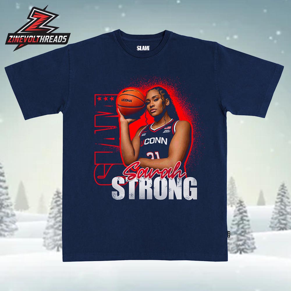 Make a statement with the Sarah Strong UConn Huskies Slam 260 Remix Heavy Tee, inspired by her powerful Slam Magazine feature and rising impact on the court. This design showcases Sarah Strong in a confident, game-ready pose, layered with bold red accents, vertical Slam elements, and strong typography that commands attention. The deep navy background and high-contrast graphics create a modern, magazine-inspired look that perfectly captures UConn pride and next-generation basketball energy.