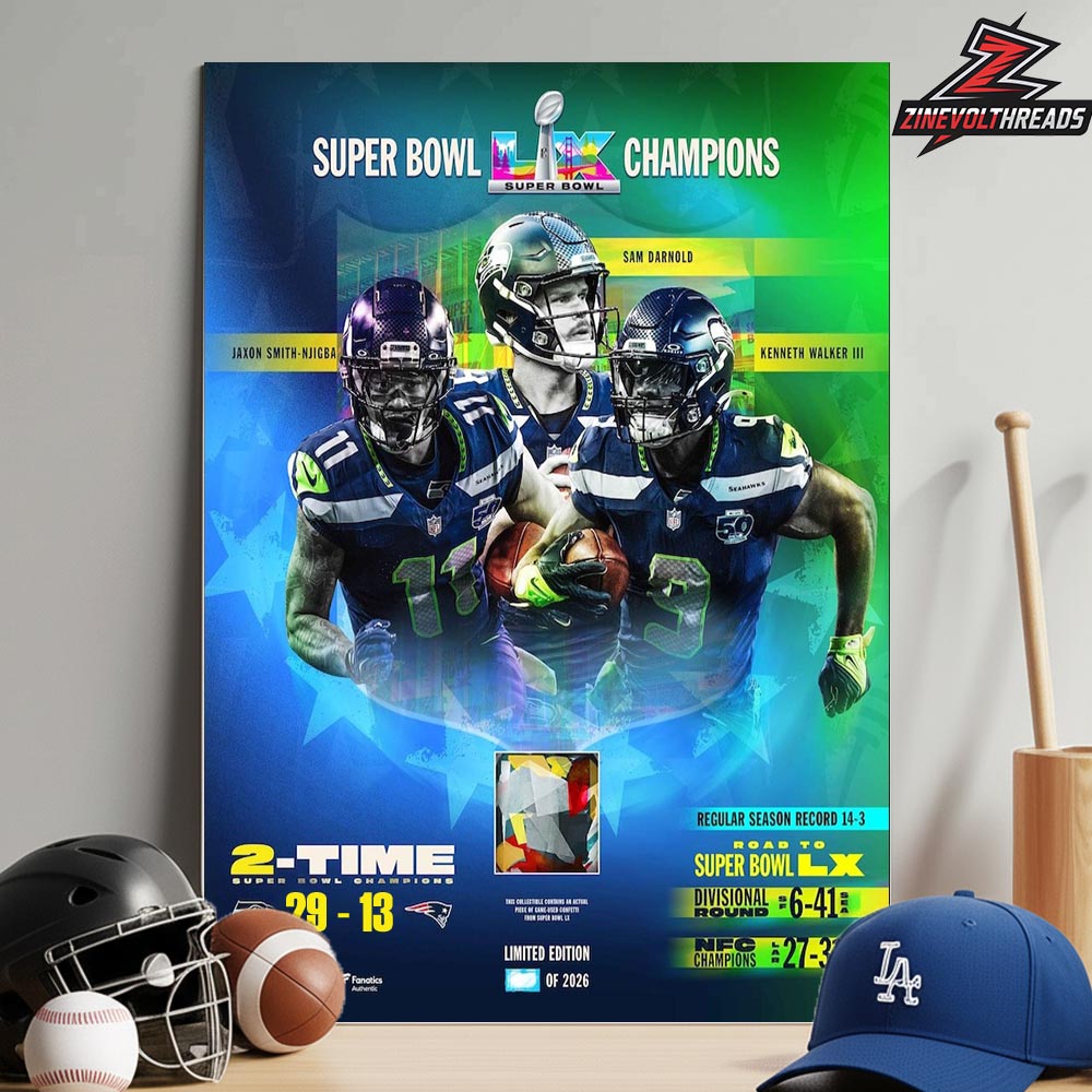 Product Highlights: Wall Art Featuring Seattle Seahawks Authentic Super Bowl LX Champions 2 Time Super Bowl Champions Home Decor Poster Canvas