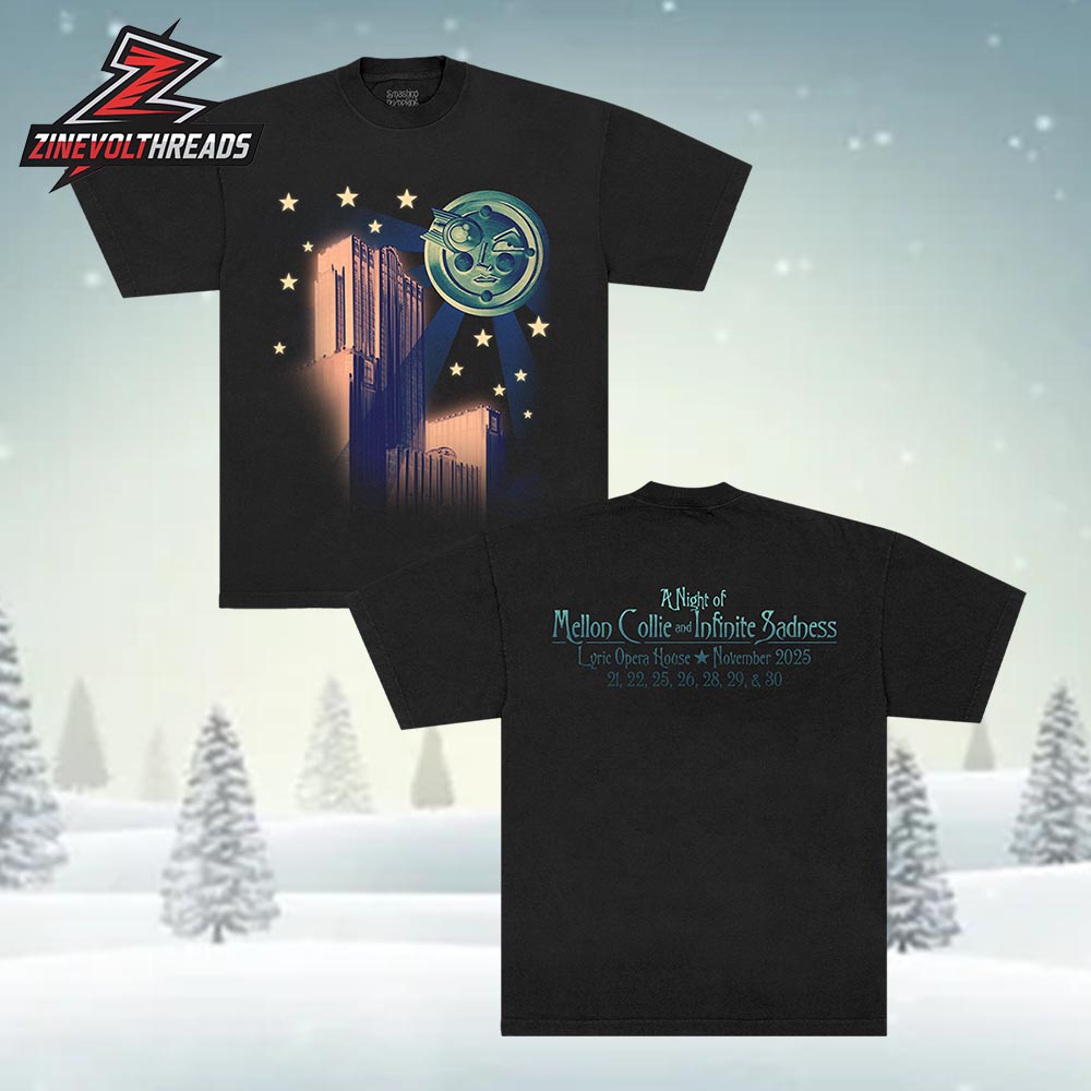 Celebrate the timeless legacy of one of alt-rock’s most influential bands with the Smashing Pumpkins Lyric Opera House Tee, a two-sided unisex shirt inspired by the special November 2025 performances. The front design features a stunning vintage-style illustration with towering architecture illuminated by a celestial moon figure and scattered stars—evoking the dreamy, surreal aesthetic that defines the band’s iconic era. This tee captures the magic and mystery of their live shows, making it a must-have collectible for fans who appreciate artistry and nostalgia in their band merch.