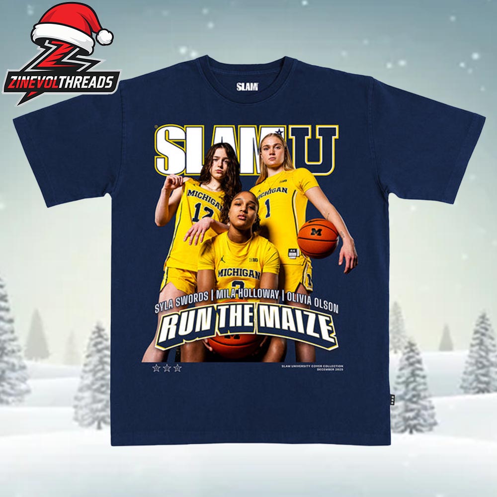 Step into the spotlight of college basketball culture with the Syla Swords Mila Holloway Olivia Olson Michigan Wolverines On SLAM University Cover Tee. Inspired by the iconic SLAM University magazine cover, this design features the three standout Michigan WBB stars in bold maize uniforms, posed with confidence and championship attitude. The oversized “SLAM U” backdrop and powerful “Run The Maize” slogan create a true magazine-cover aesthetic that celebrates dominance, teamwork, and Wolverines pride.