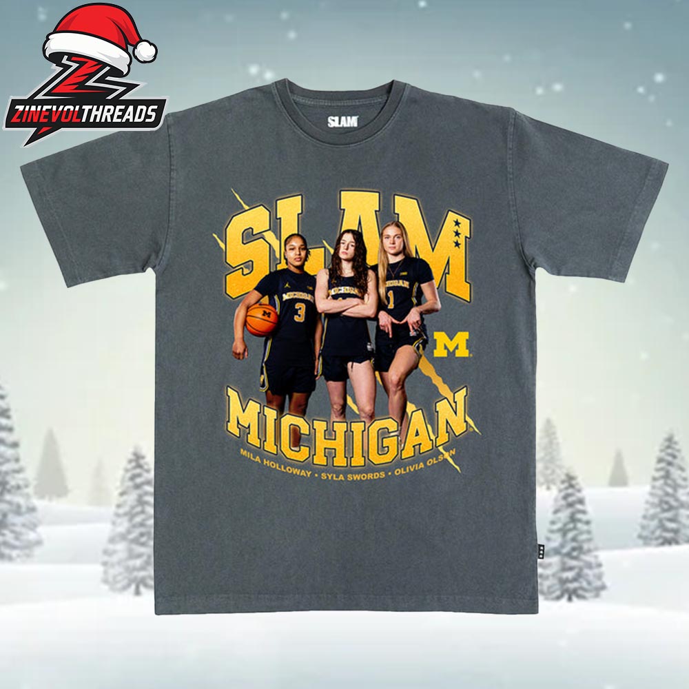 Show your love for elite women’s college basketball with the Syla Swords Mila Holloway Olivia Olson Michigan Wolverines WBB Slam Scratch Remix Heavy Tee. Inspired by SLAM magazine’s bold visual style, this design features the trio front and center in strong, confident poses layered over oversized “SLAM” and “Michigan” lettering. The scratch-effect graphics, vintage wash look, and iconic maize-and-blue palette create a powerful statement that celebrates strength, teamwork, and Wolverines pride.