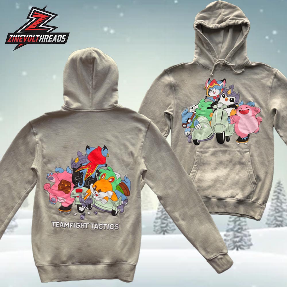 The TFT Little Legends Squad Hoodie brings the charm of Teamfight Tactics straight into your wardrobe with a fun, vibrant two-sided design. The front showcases a group of adorable Little Legends riding together in a playful scooter scene, featuring fan-favorite companions like Featherknight, Pengu, Choncc, and more. The back expands the artwork into a full squad illustration, capturing the chaotic, cute, and adventurous spirit that makes TFT so iconic. Bright colors, hand-drawn cartoon lines, and expressive poses give this hoodie a premium, collectible look.