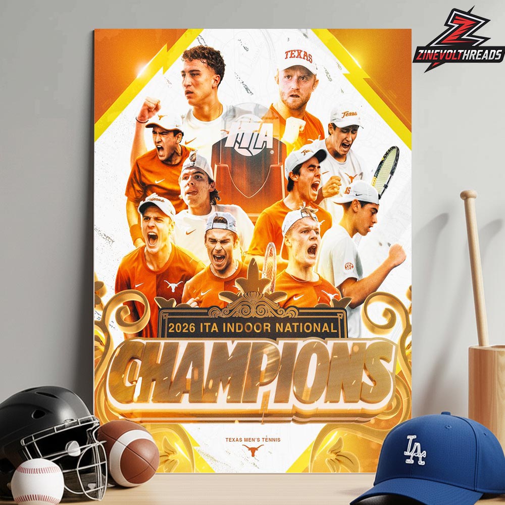 Celebrate championship dominance with this bold Texas Longhorns 2026 ITA Indoors National Champions home decor poster canvas. Featuring the Texas menβs tennis team in powerful action poses against a striking burnt orange and gold backdrop, this dynamic design captures the intensity, passion, and pride of their national title run. The oversized βChampionsβ headline and elegant gold detailing highlight the prestige of the 2026 ITA Indoor National Championship, making this Texas Longhorns tennis poster a must-have for devoted Longhorns fans.