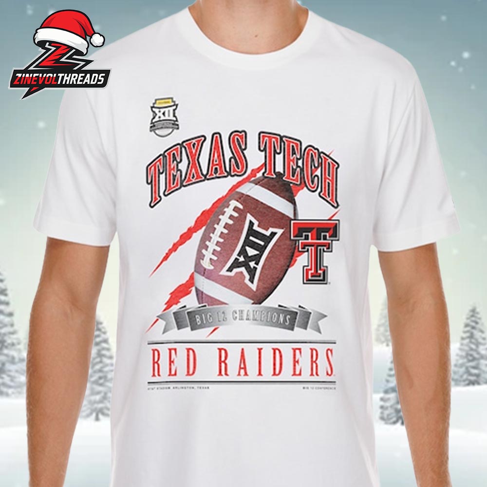 Set on a clean white backdrop, the design features a bold “TEXAS TECH” arched graphic above a Big 12 football emblem bursting through dynamic red claw-mark streaks—symbolizing grit, power, and the relentless Red Raider spirit. The iconic Double T logo sits front and center, proudly reinforcing Tech’s championship identity. Beneath it all, a silver ribbon proudly states “Big 12 Champions,” while “RED RAIDERS” stretches across the bottom in classic collegiate typeface.