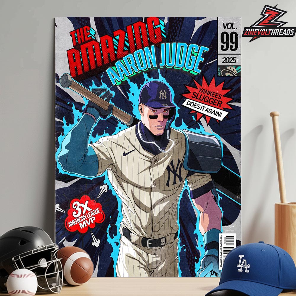Add bold energy to your space with the The Amazing Aaron Judge New York Yankees 3x American League MVP Home Decor Poster Canvas. Designed like an action-packed comic cover, this artwork features a dynamic illustrated version of Judge, complete with explosive colors, dramatic outlines, and iconic Yankees details. The “3X American League MVP” badge highlights his incredible achievements, while the “Yankees Slugger Does It Again!” headline brings extra excitement to the design—making it a perfect showcase piece for any true fan.