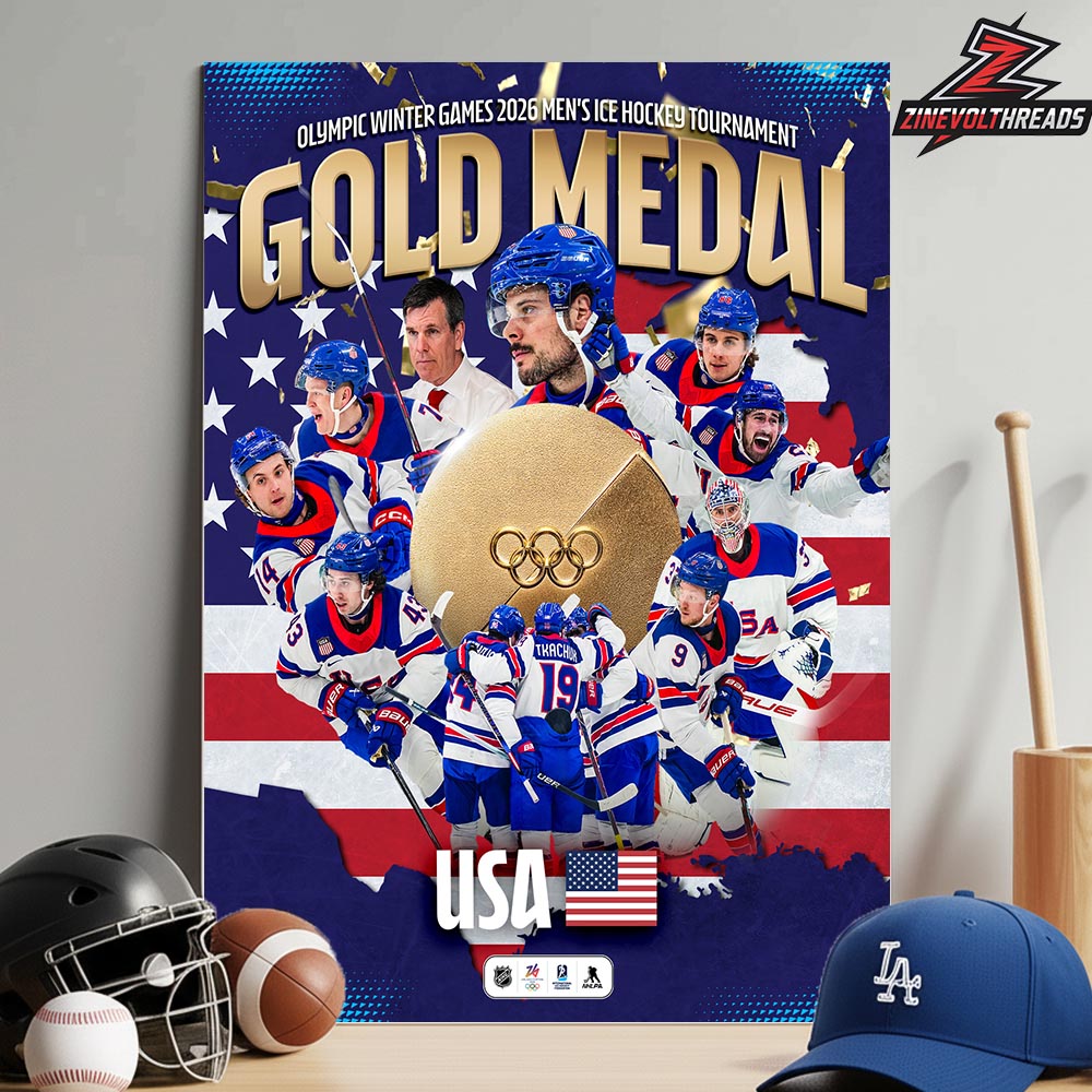 Honor a legendary triumph on the world stage with this USA Hockey National Team Olympic Winter Games 2026 Men’s Ice Hockey Tournament Gold Medal home decor poster canvas. Celebrating Team USA’s championship performance at the Milano Cortina Winter Olympics, this bold design showcases the players in action, united beneath the American flag and crowned by striking gold medal graphics. The powerful “Gold Medal” headline and dynamic composition capture the intensity, pride, and determination that defined the U.S. men’s hockey team’s unforgettable 2026 Olympic run.
