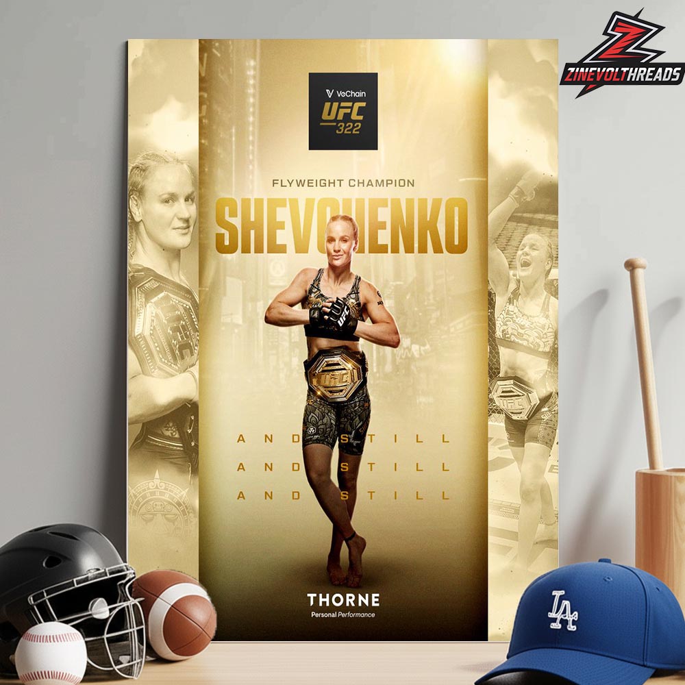 Celebrate the dominance of one of MMA’s greatest champions with the Valentina Shevchenko Defeats Zhang Weili By Unanimous Decision To Remain The Flyweight Champion Home Decor Poster Canvas. Featuring a powerful central portrait of Shevchenko proudly holding her championship belt, surrounded by dynamic fight-night imagery, this striking gold-themed design captures the intensity, confidence, and legacy of “Bullet” after another championship victory. The repeated “AND STILL” text highlights her continued reign at the top of the UFC flyweight division.