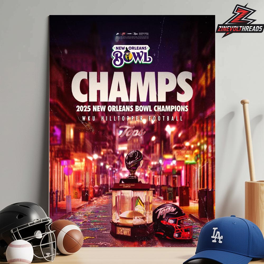 Celebrate a historic postseason victory with the Western Kentucky Hilltoppers Is The 2025 New Orleans Bowl Champions NCAA Football Home Decor Poster Canvas. This striking artwork captures the electrifying atmosphere of New Orleans, featuring vibrant city lights, championship typography, and the iconic bowl trophy at center stage. The bold “Champs” headline and official New Orleans Bowl branding perfectly commemorate WKU’s triumphant 2025 run, making this piece a powerful visual tribute to Hilltoppers football success.